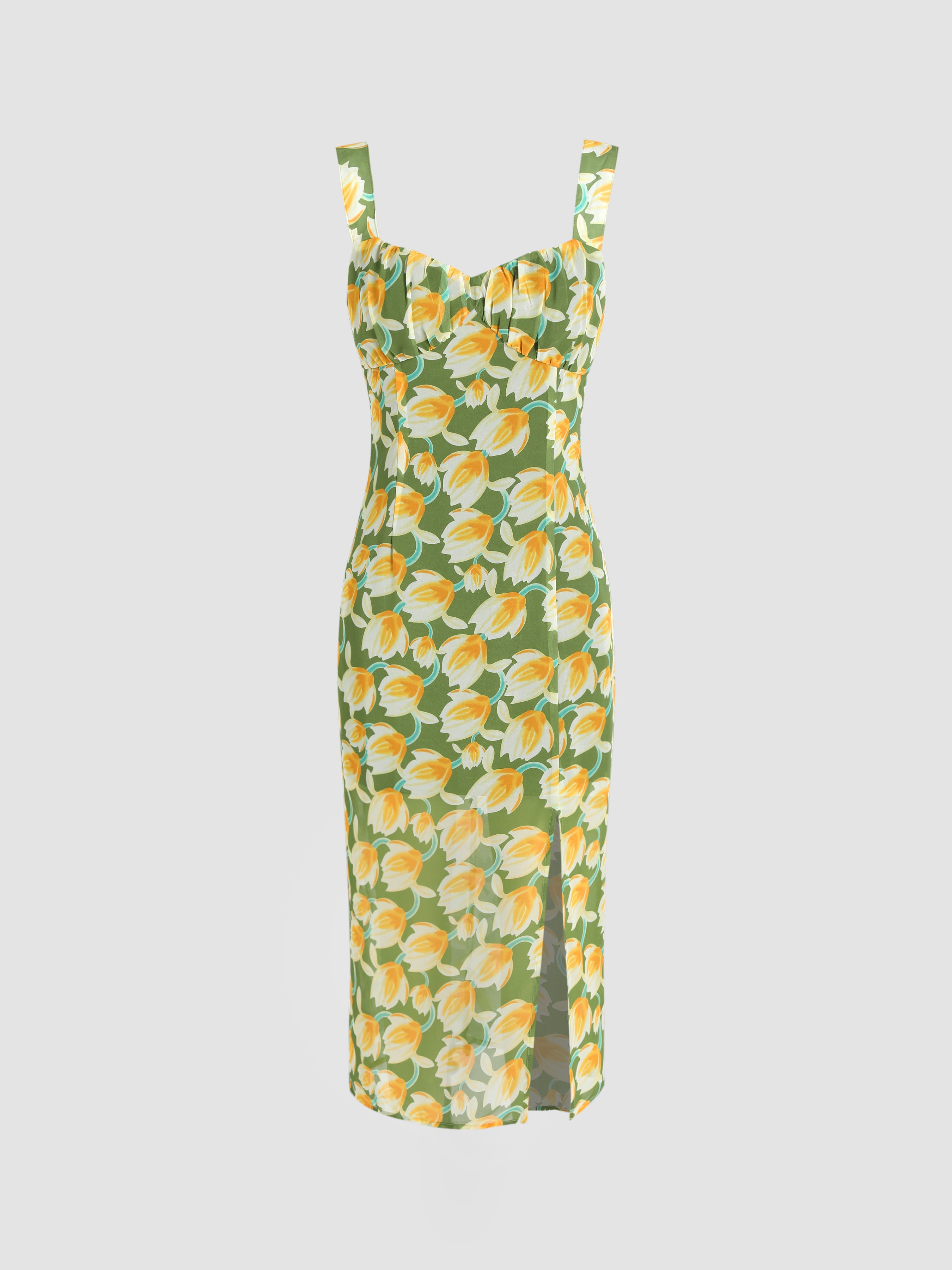 Floral Ruched Split Midi Dress