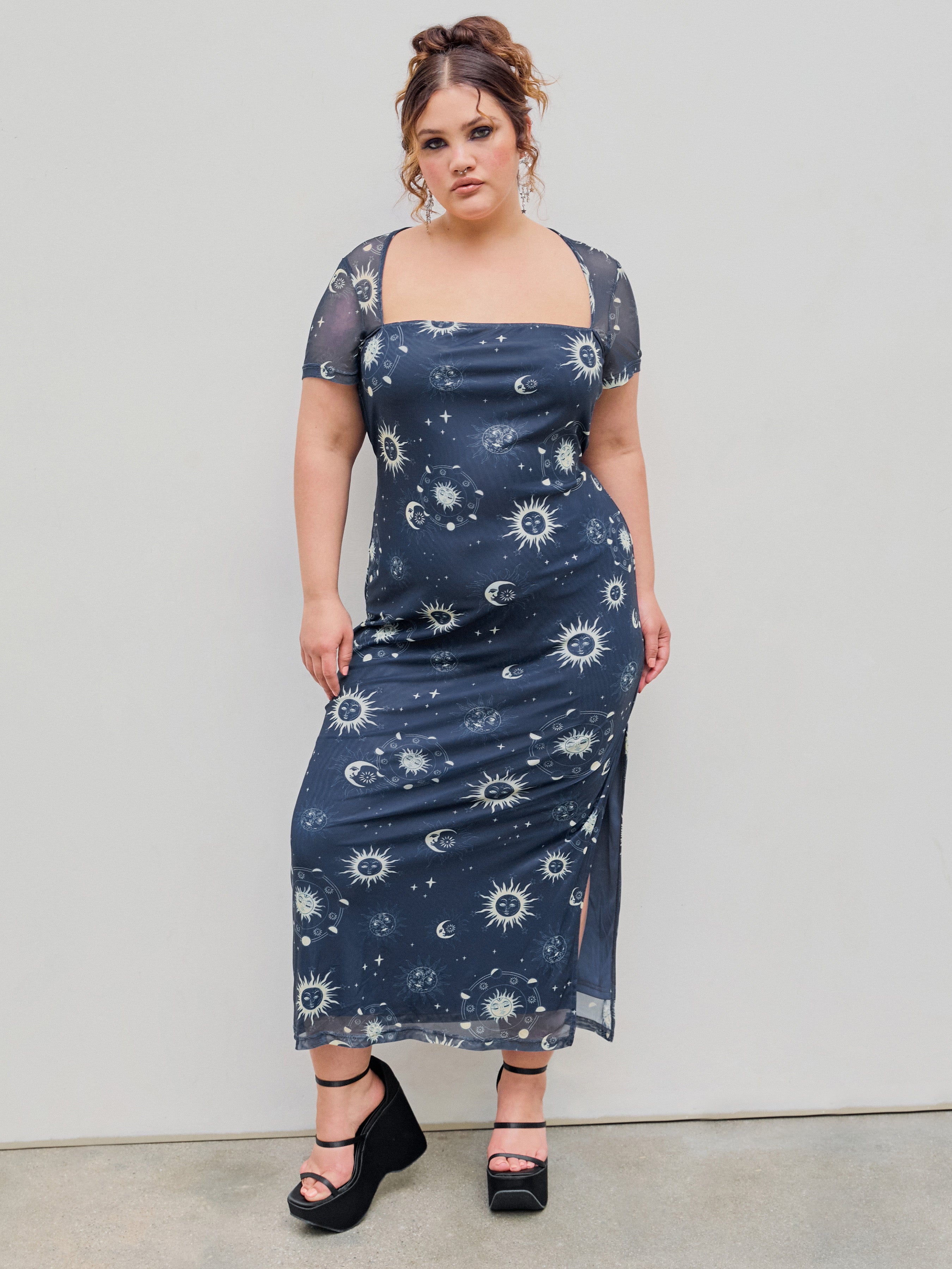 Mesh Square Neck Star & Moon  Maxi Dress Curve & Plus