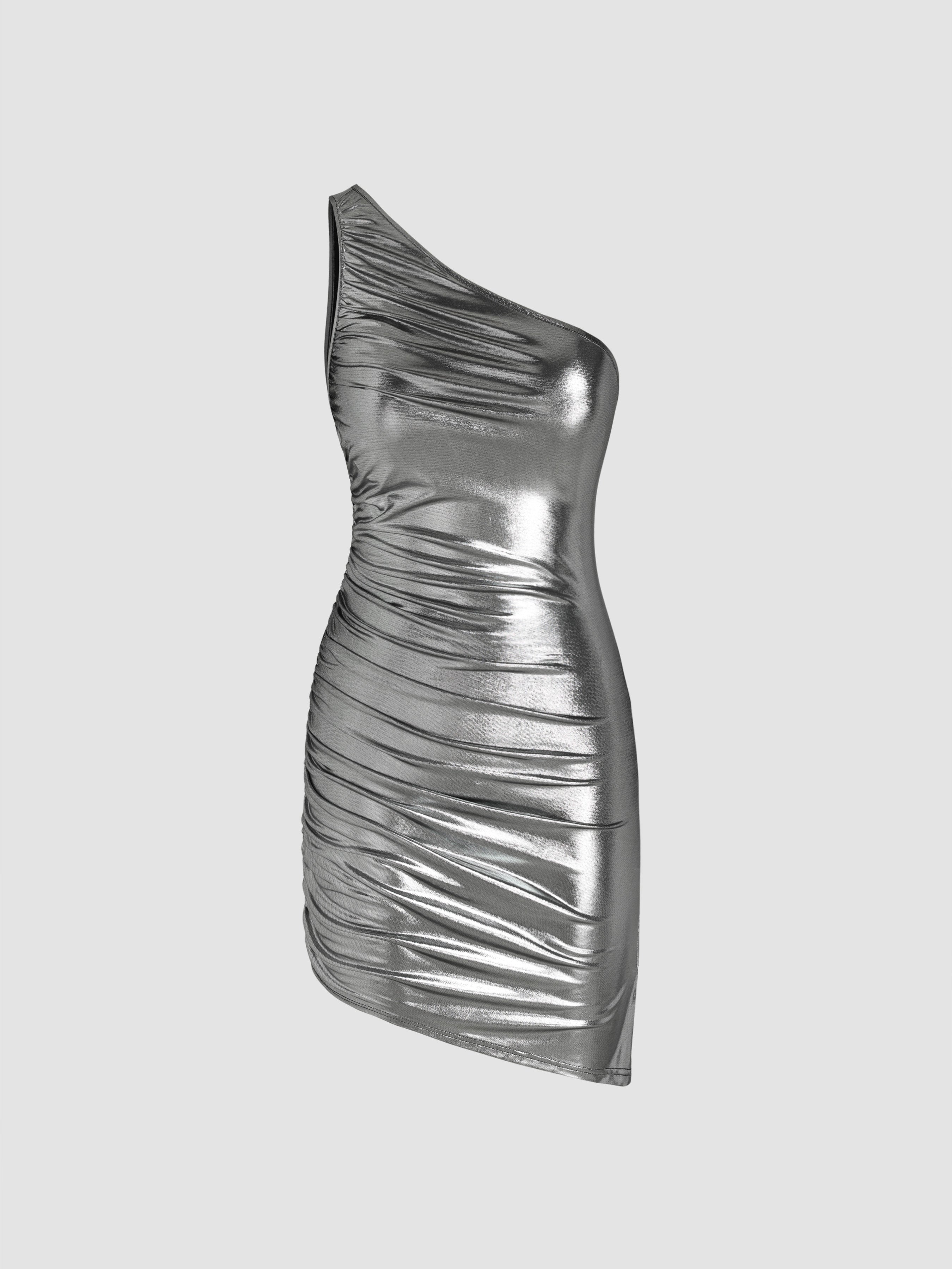 Metallic Asymmetrical Neck Ruched Mini Dress