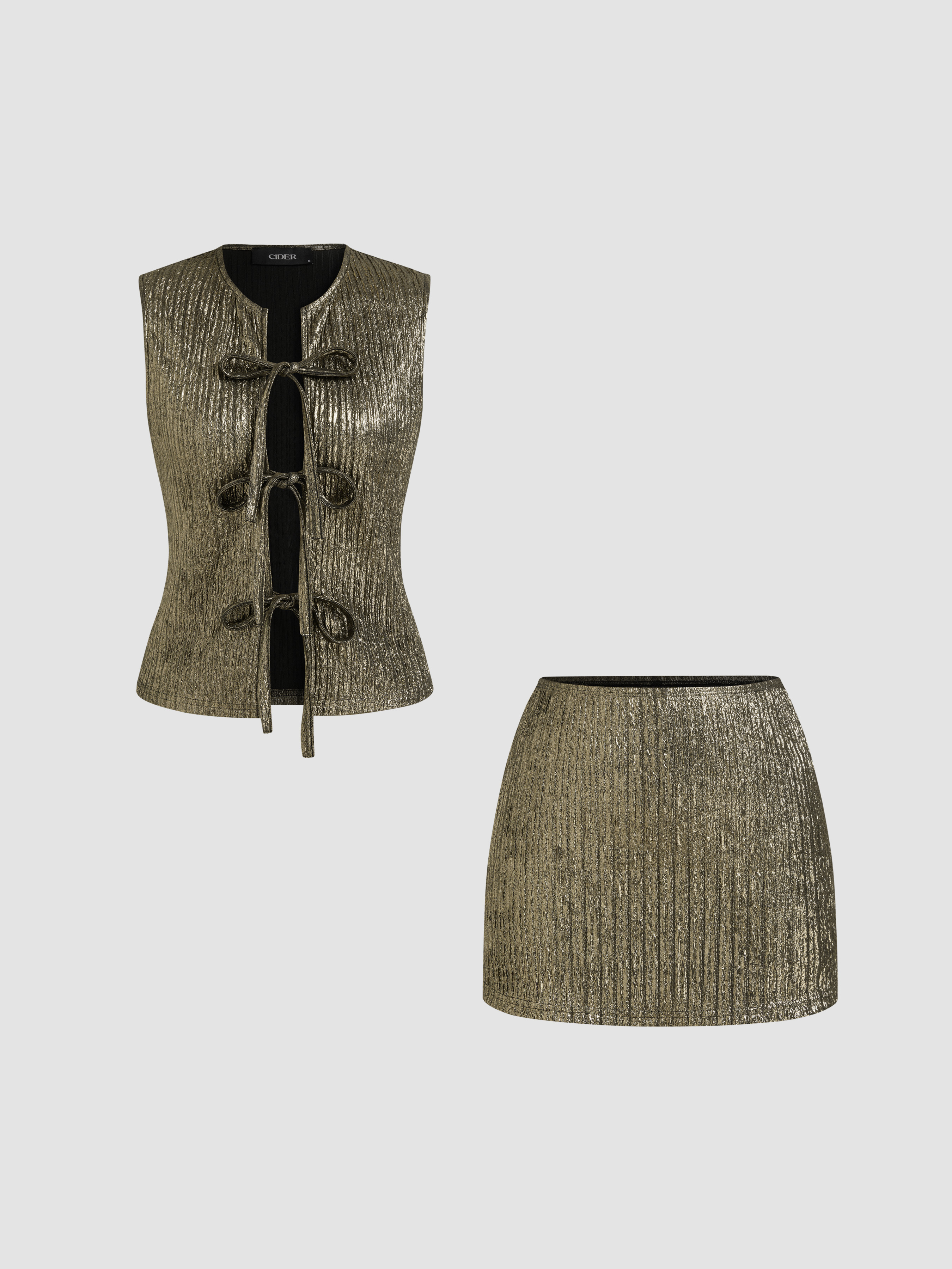 Metallic Round Neckline Solid Tie Front Tank Top & Low Rise Mini Skirt Set