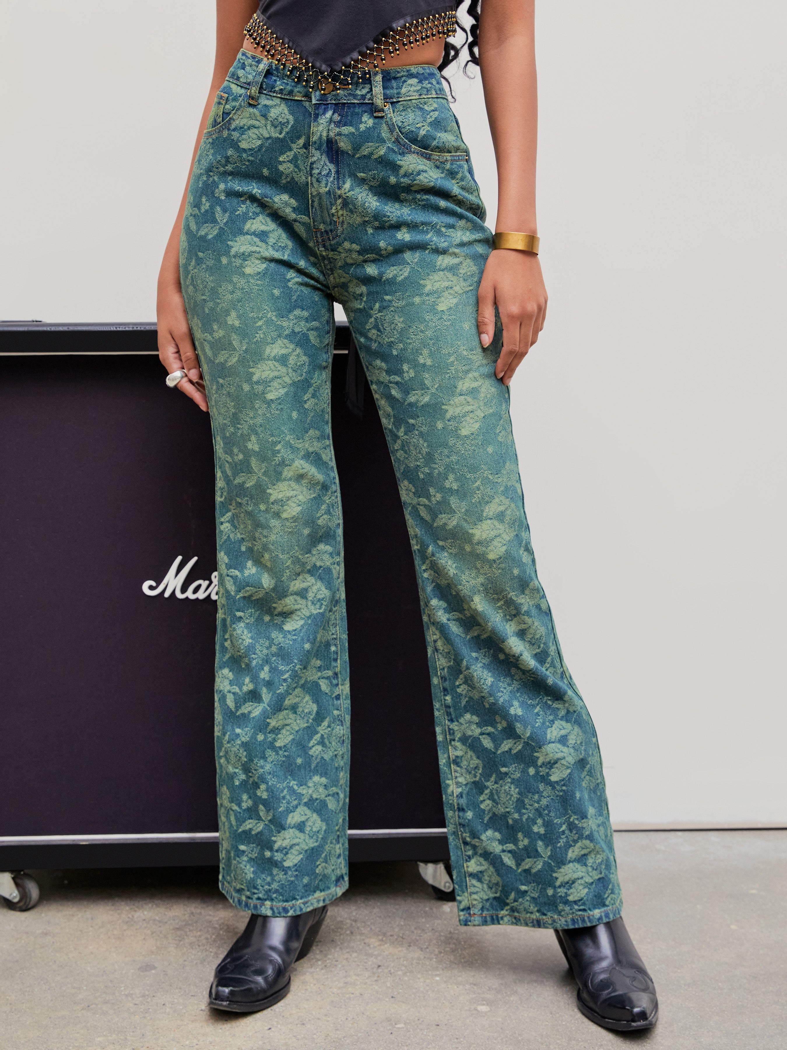 Mid Rise Floral Print Flared Jeans