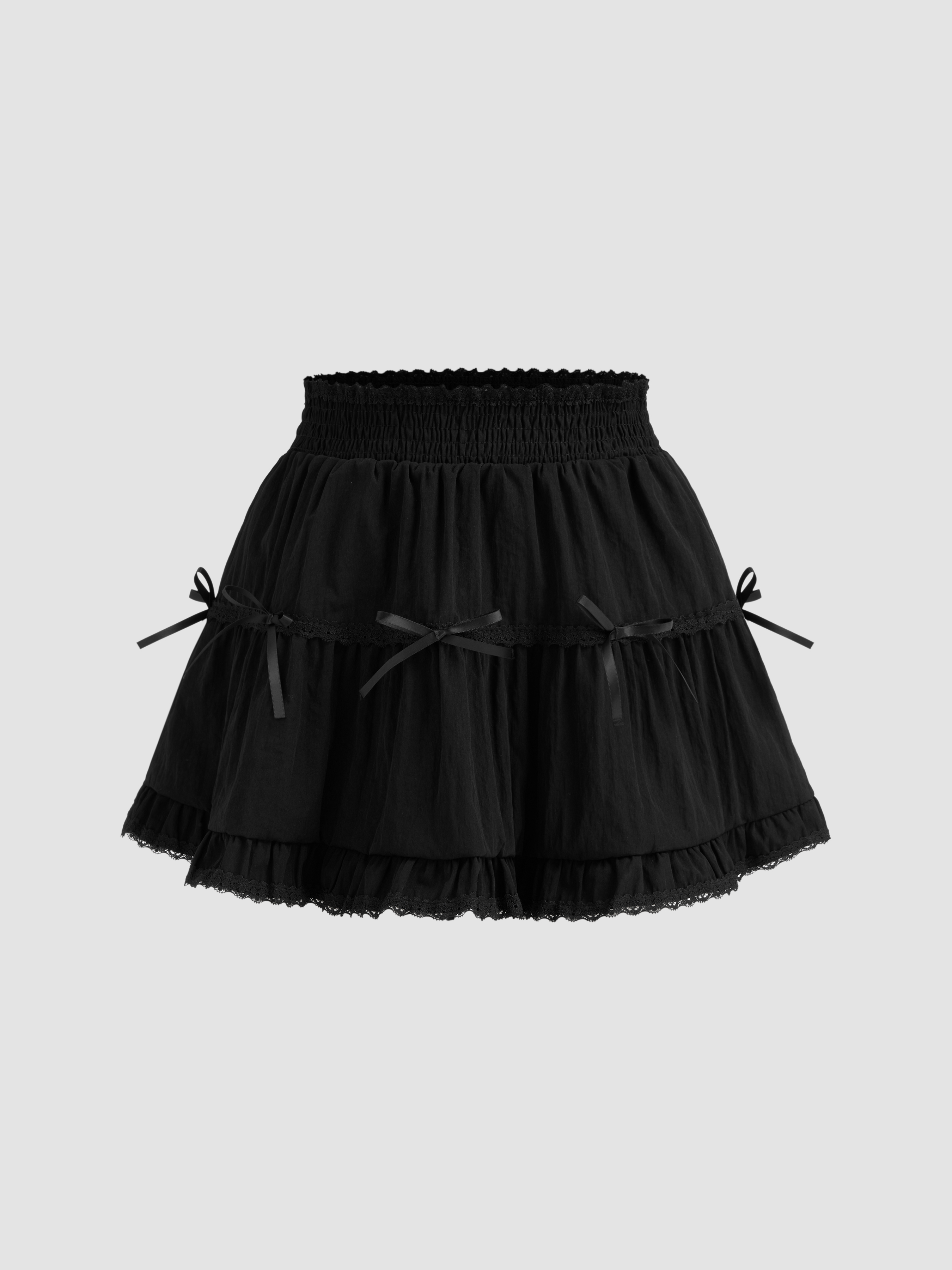 Mid Rise Solid Bowknot Lace Trim Elastic Waist Shirred Skort