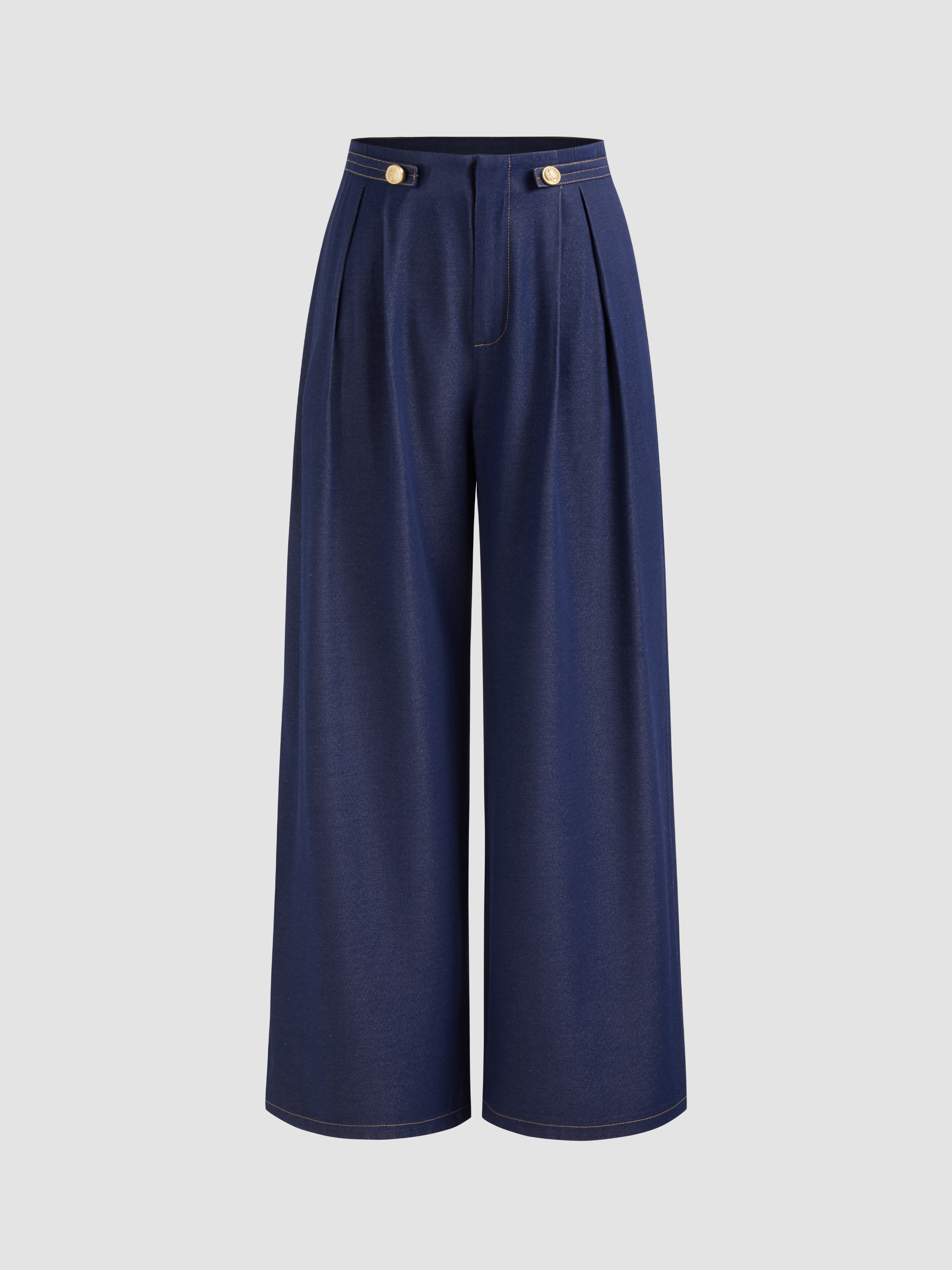Mid Rise Solid Button Pocket Pleated Wide Leg Trousers