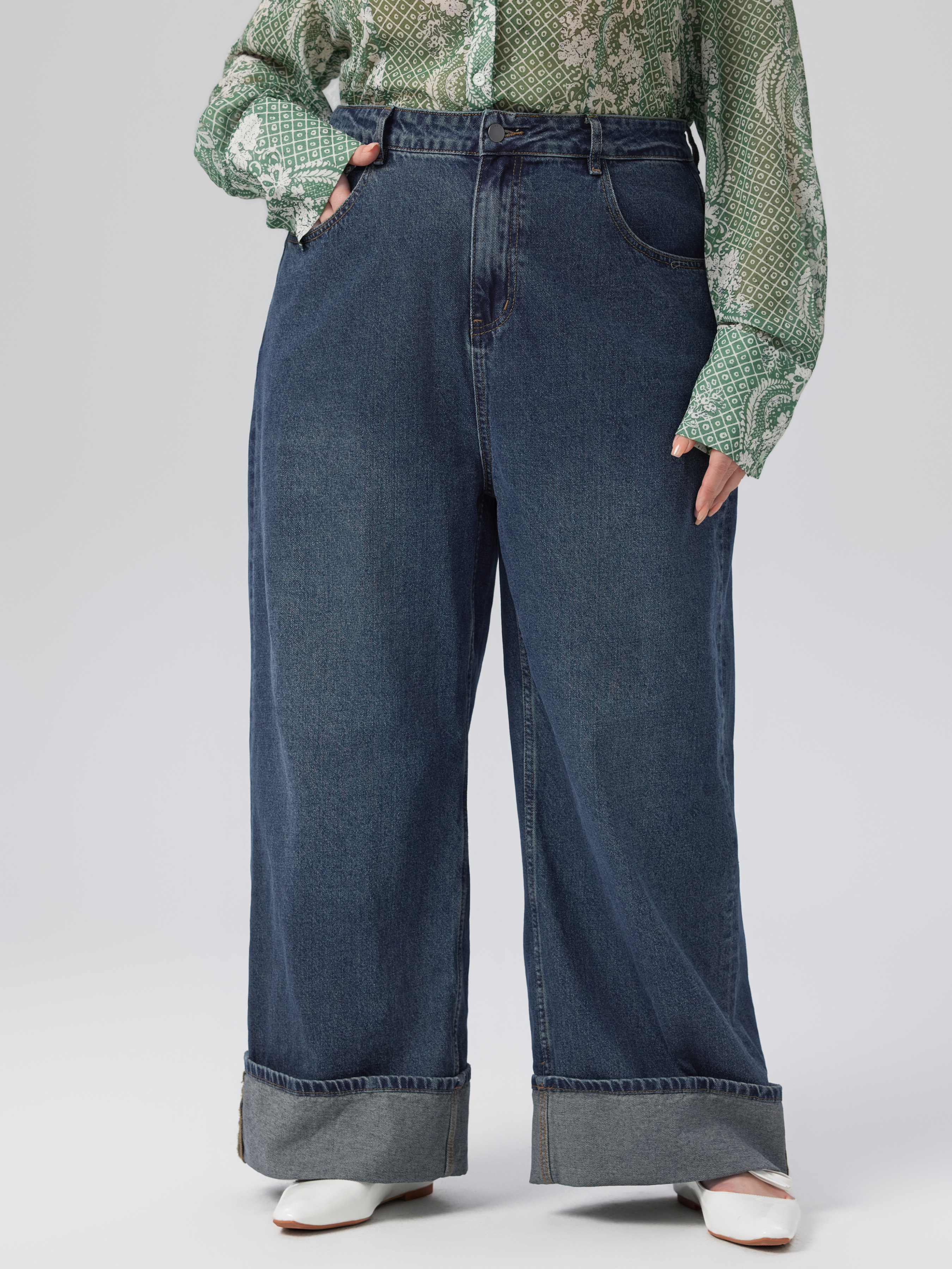 Mid Rise Solid Button Wide Leg Jeans Curve & Plus