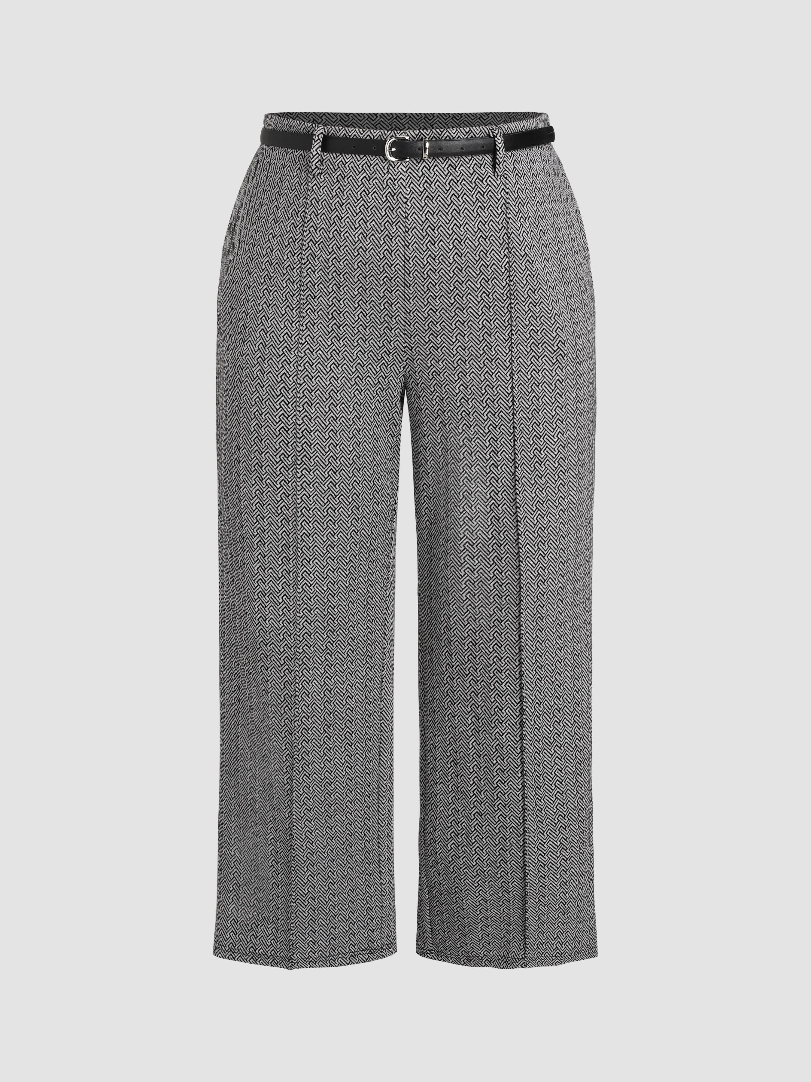 Mid Waist Geometric Straight Leg Trousers With Belt Curve & Plus