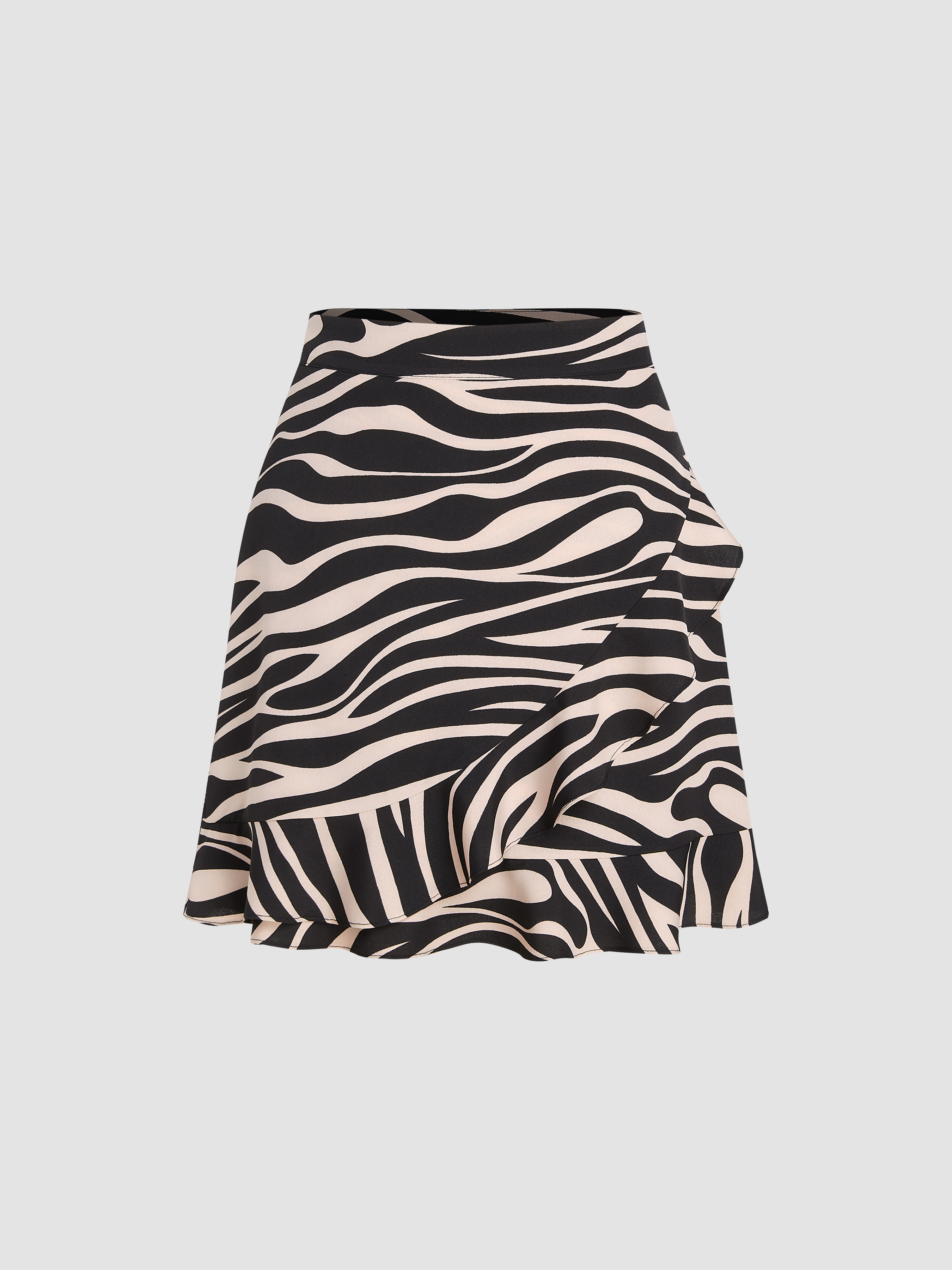 Mid Waist Zebra Stripe Ruffle Hem Mini Skirt