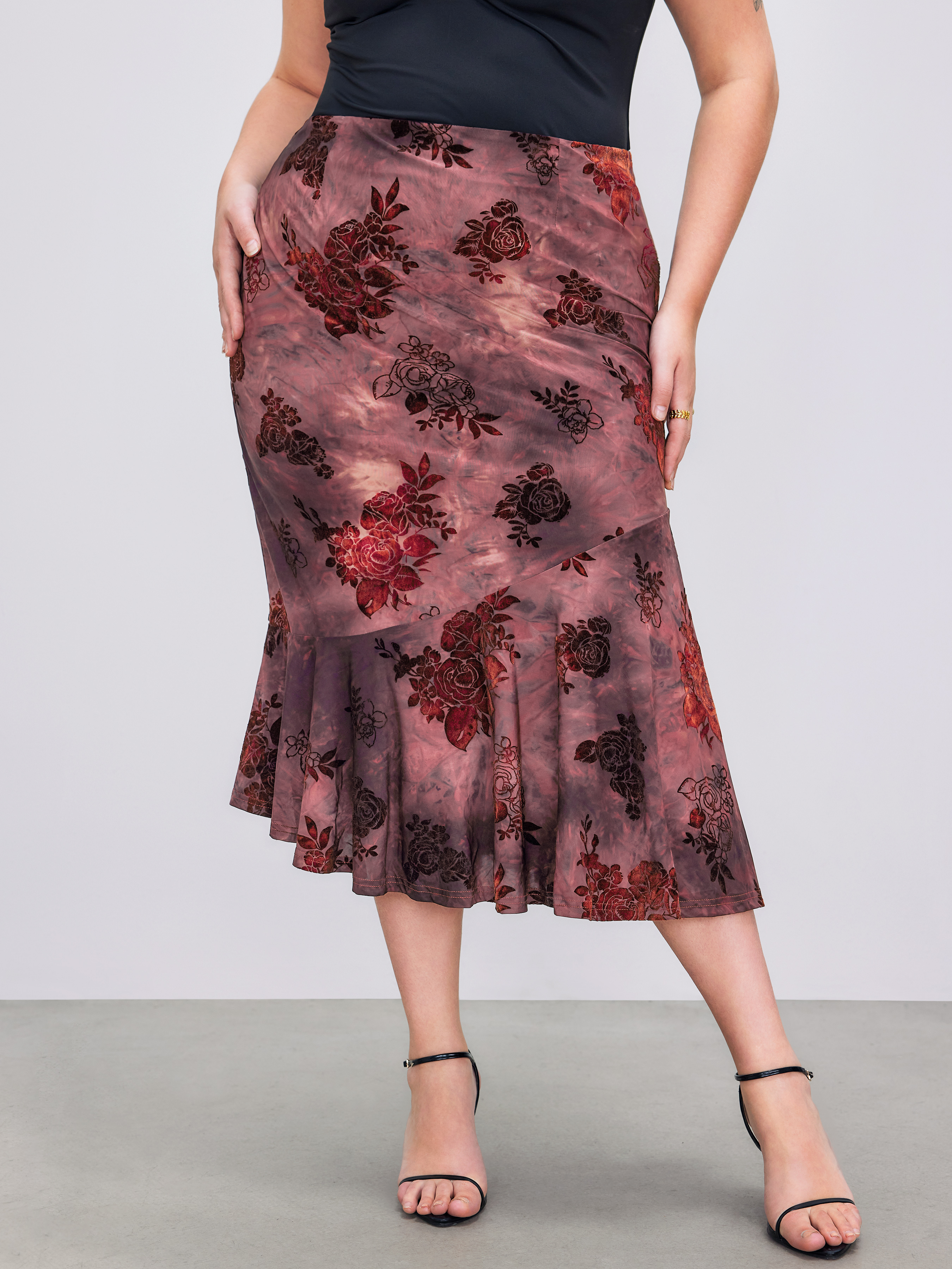 Middle Waist Floral Ruffle Mermaid Midi Skirt Curve & Plus