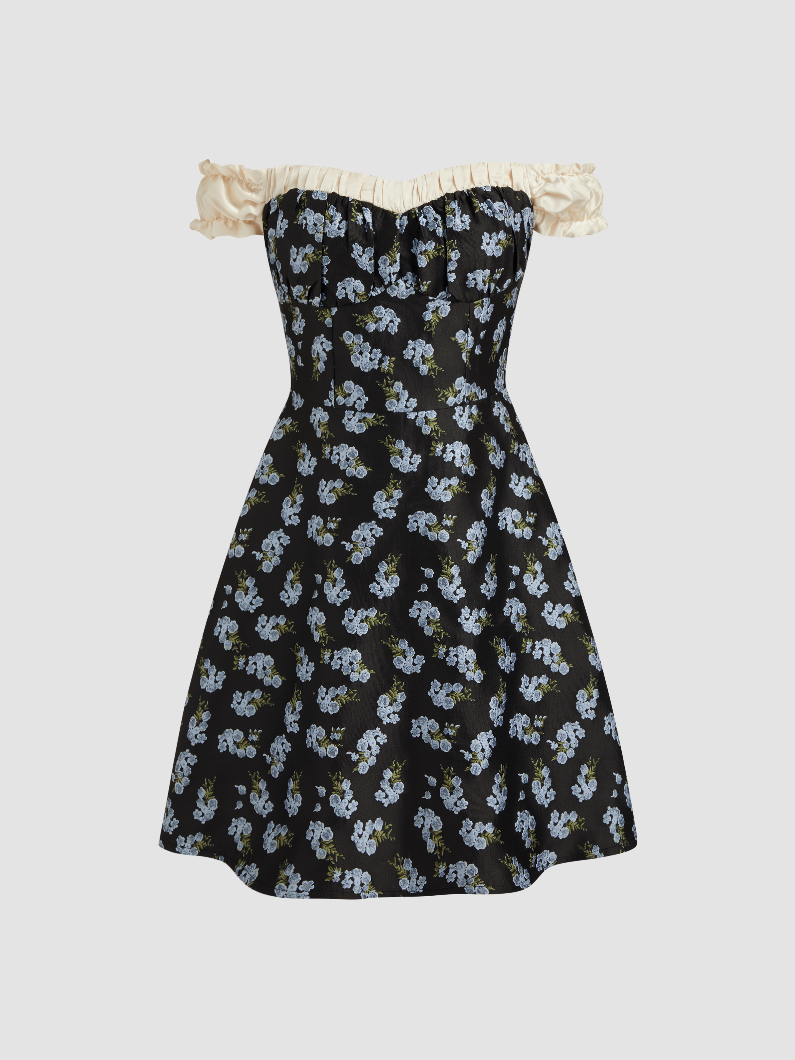 Off-shoulder Floral Corset Contrasting Binding Mini Dress