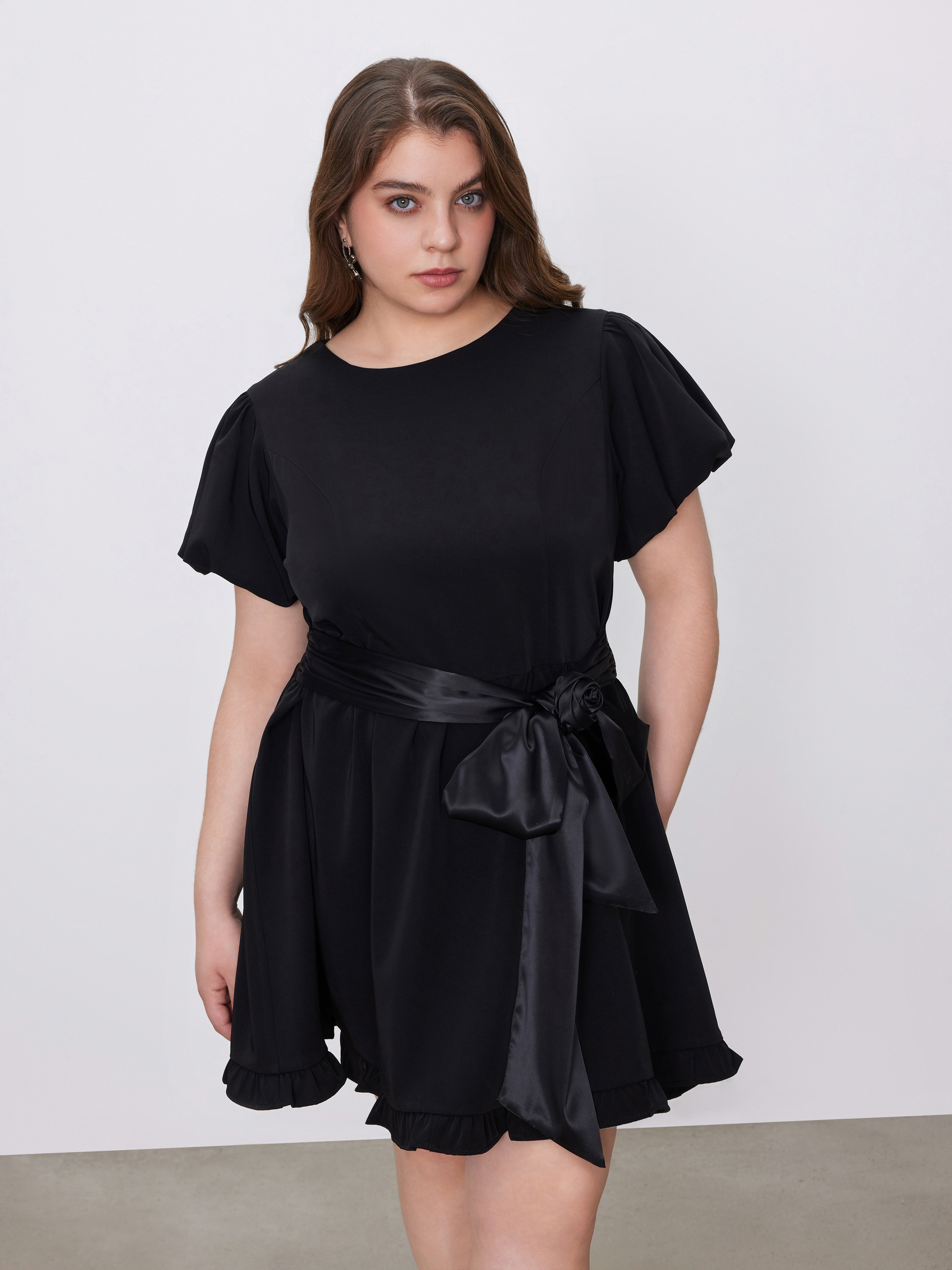 Rosette Round Neck Ruffle Hem Mini Dress Curve & Plus