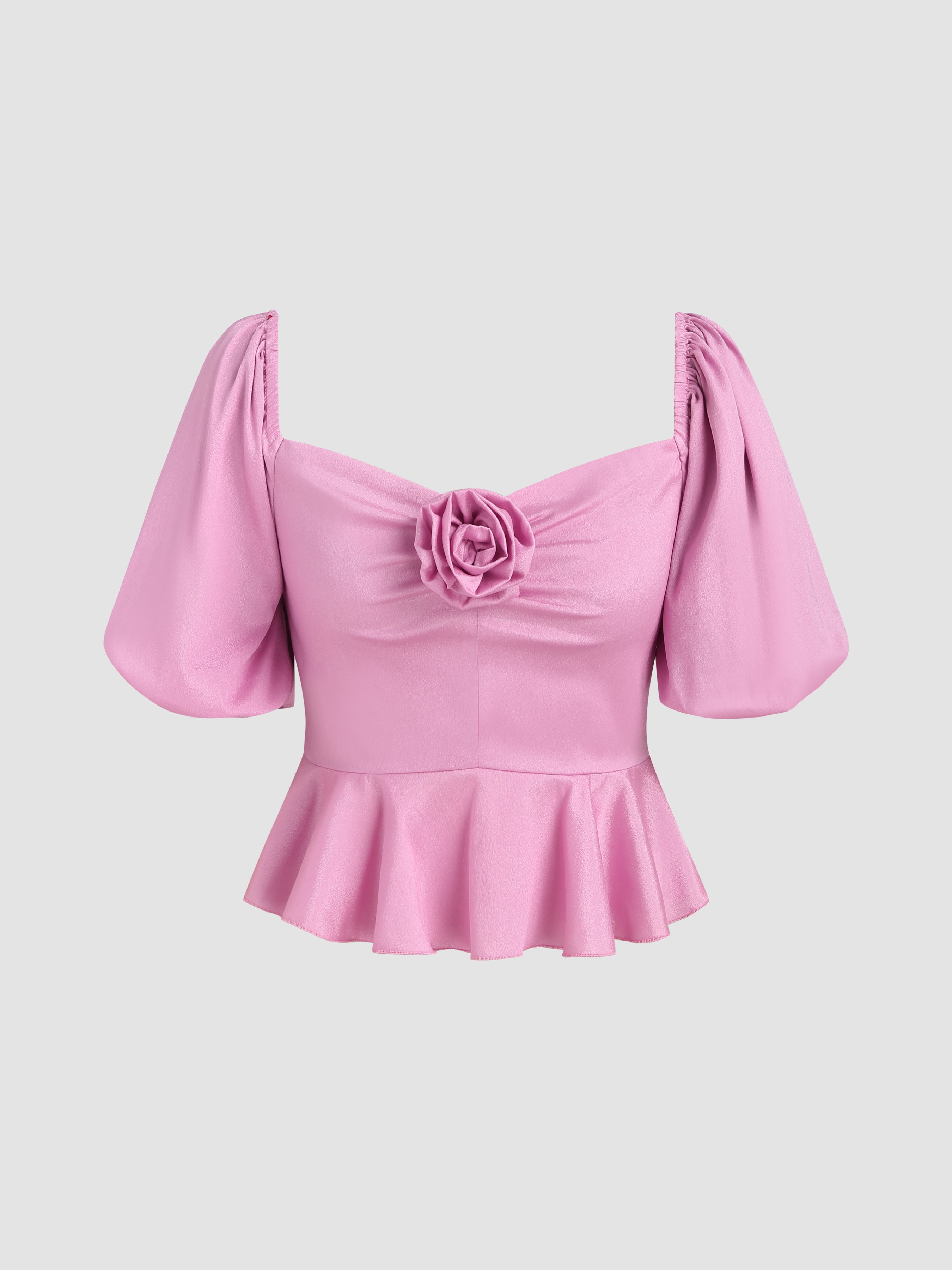Rosette Ruffle Hem Puff Sleeve Blouse