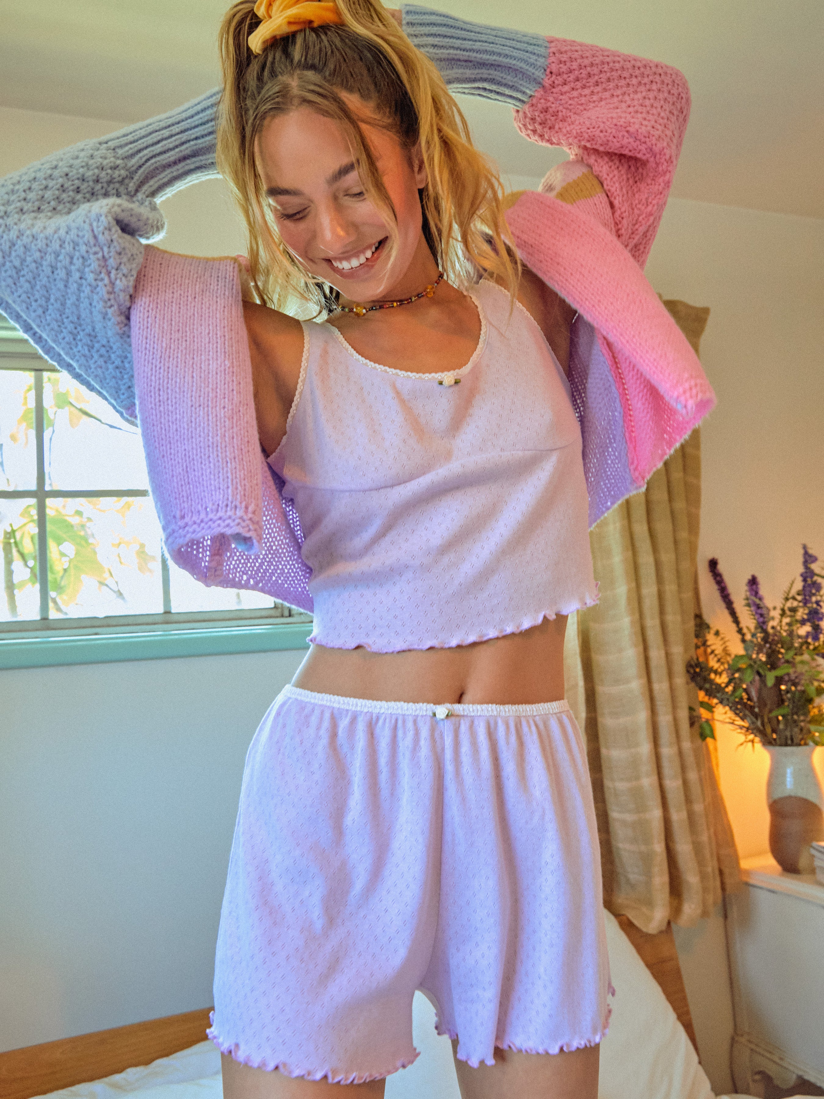Rosette U-neckline Lettuce Trim Top & High Waist Shorts Pajama Set