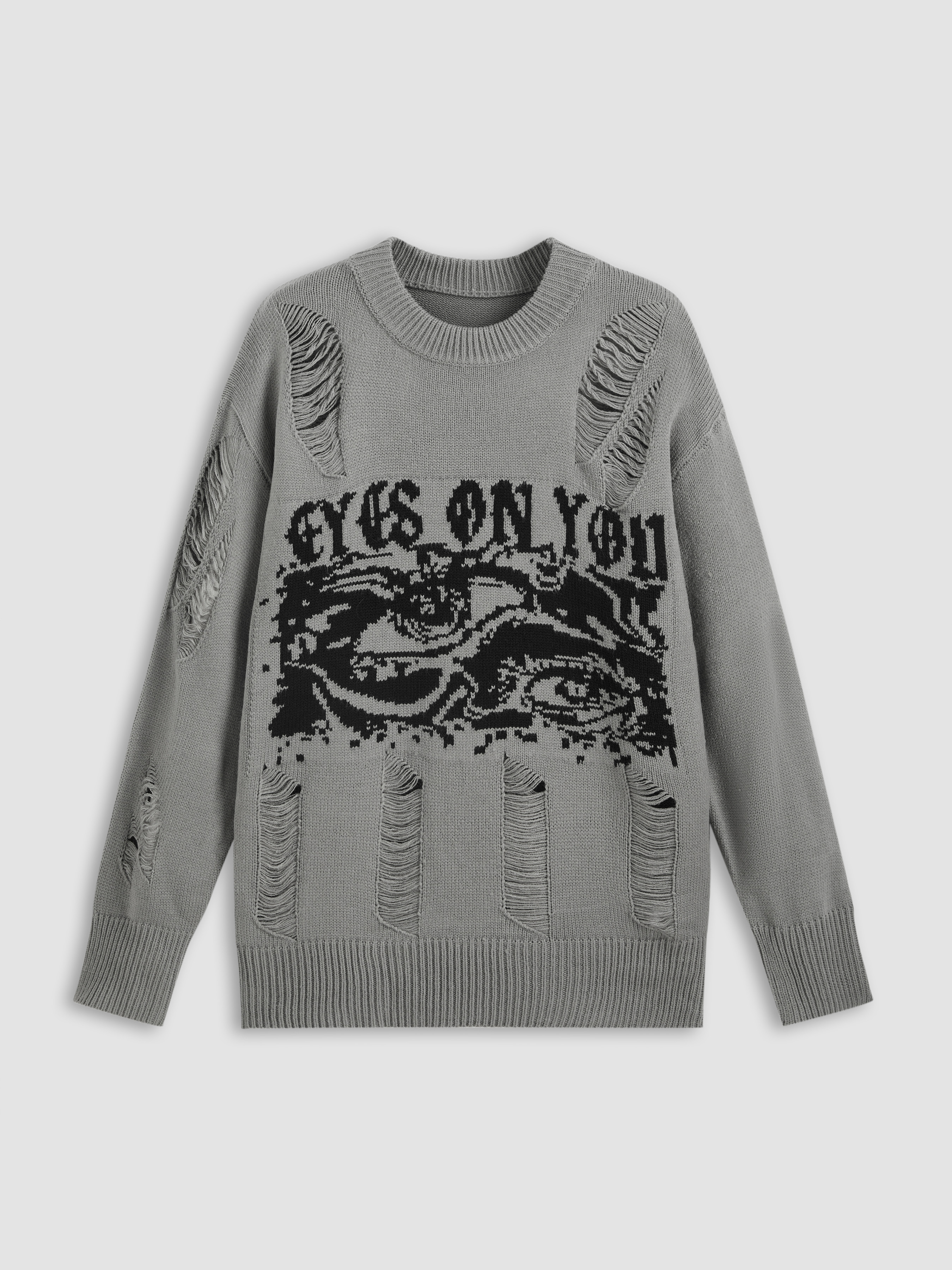 Round Neckline Graphic Ripped Knitted Long Sleeve Top