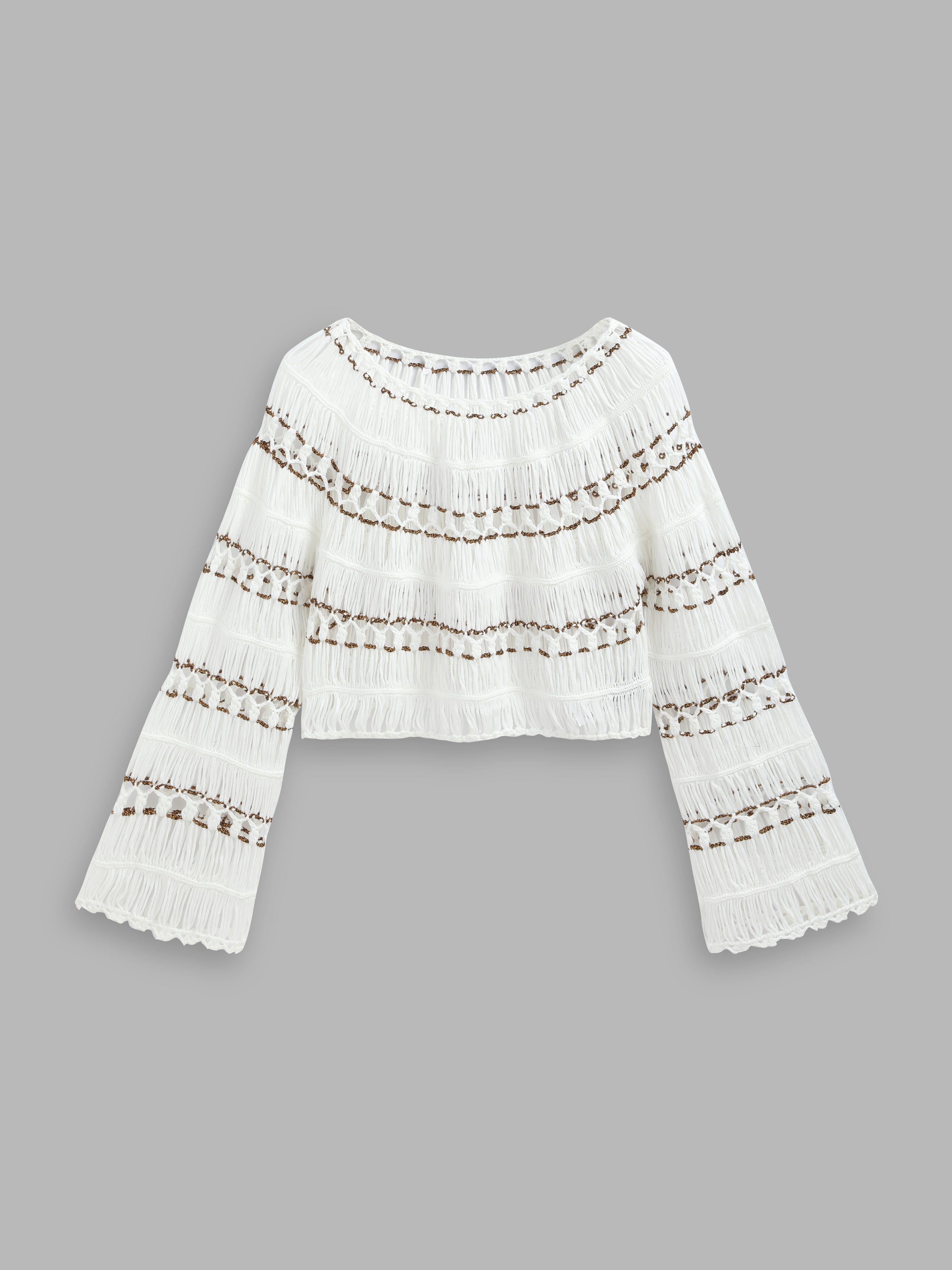 Round Neckline Hollow Out Knitted Long Sleeve Crop Top
