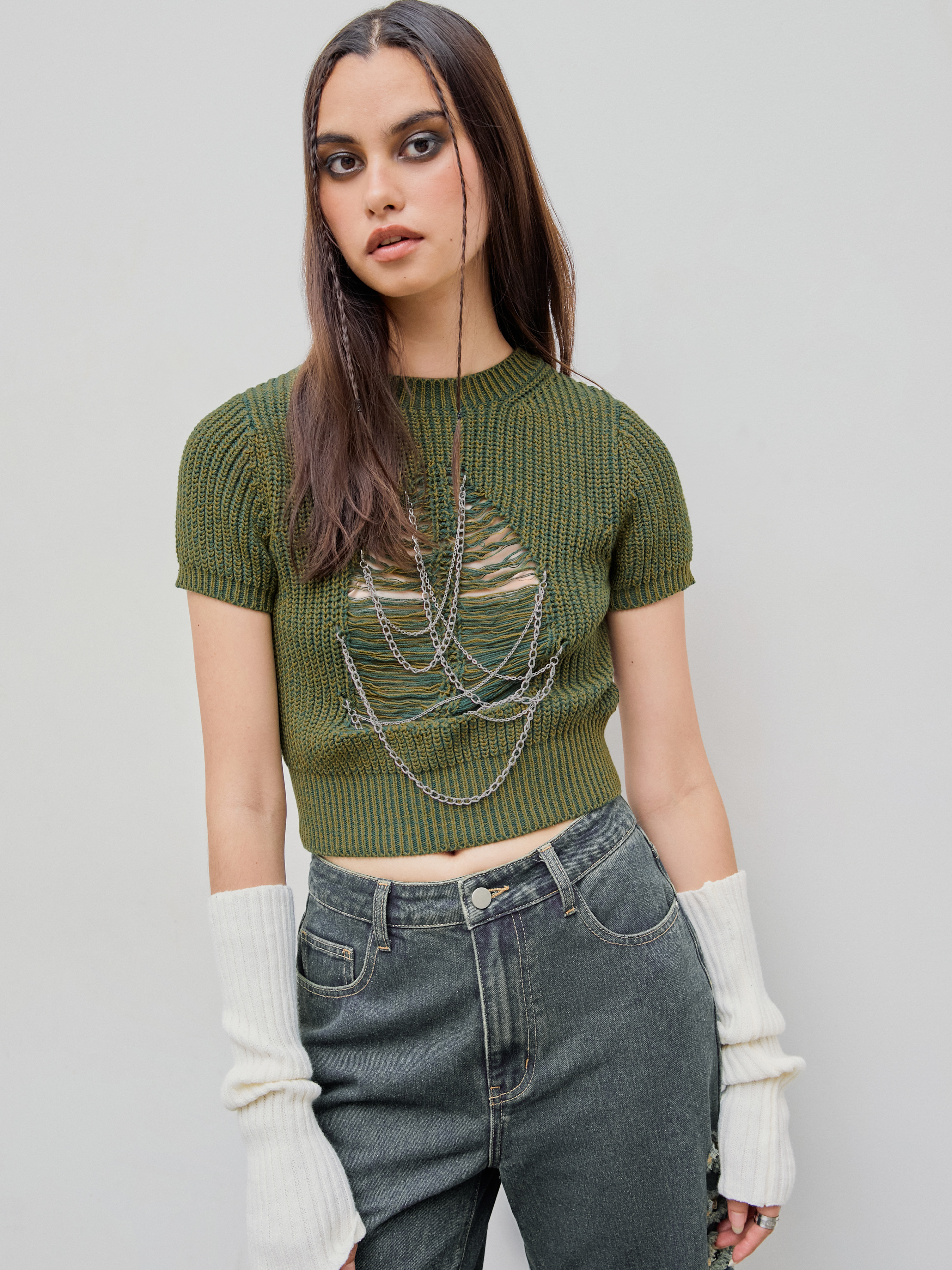 Round Neckline Solid Chain Ripped Knitted Short Sleeve Crop Top