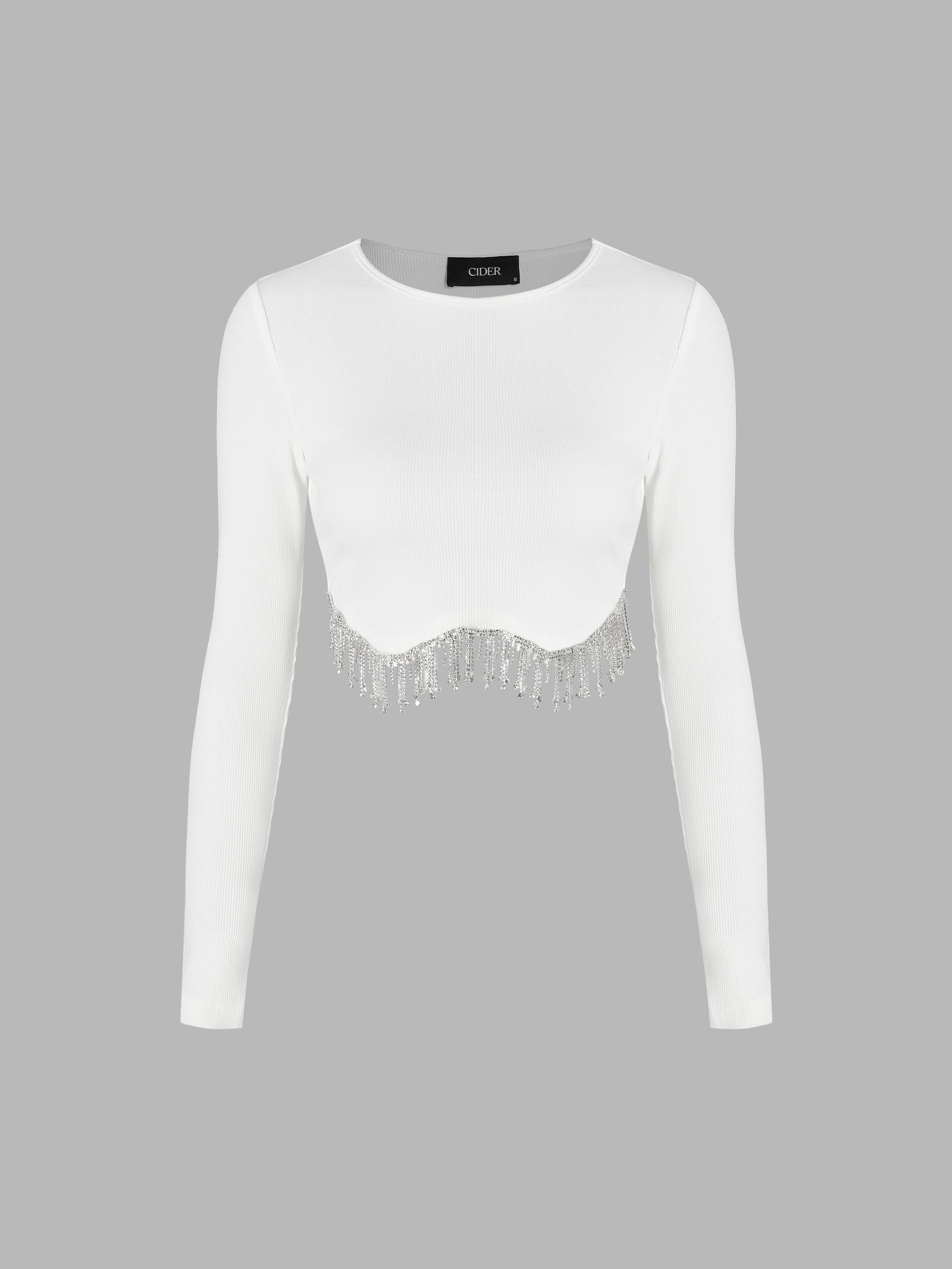 Round Neckline Solid Tassel Long Sleeve Crop Tee