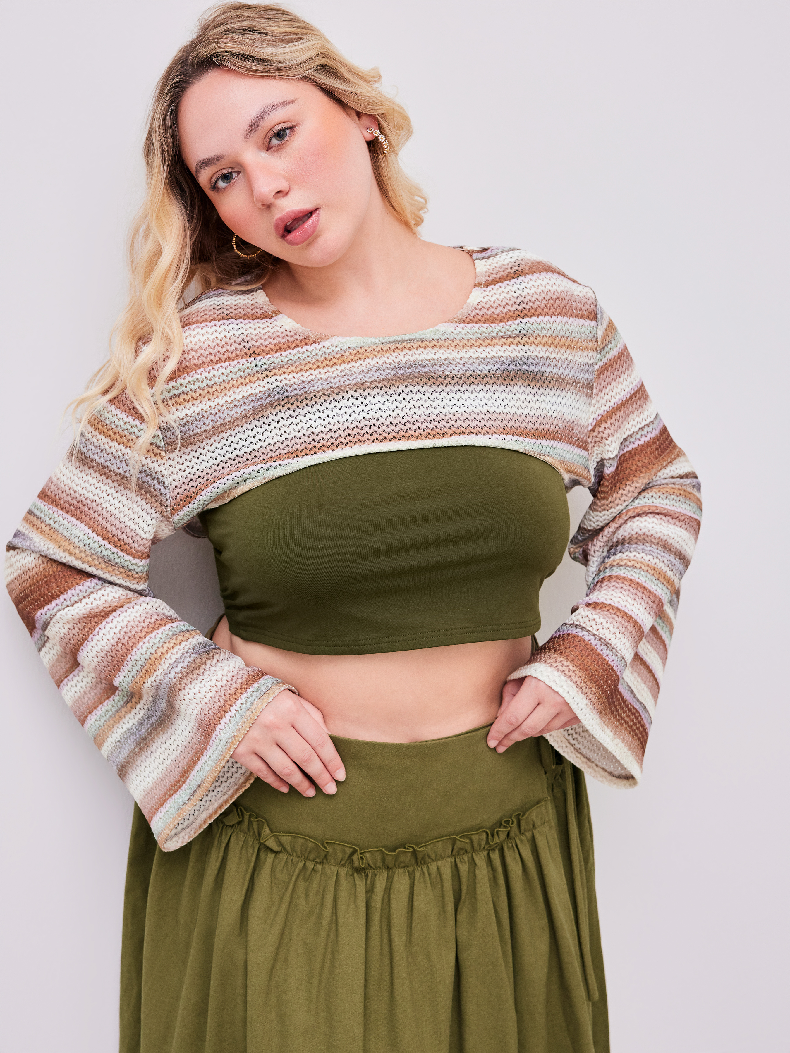 Round Neckline Striped Long Sleeve Crop Shrug Curve & Plus