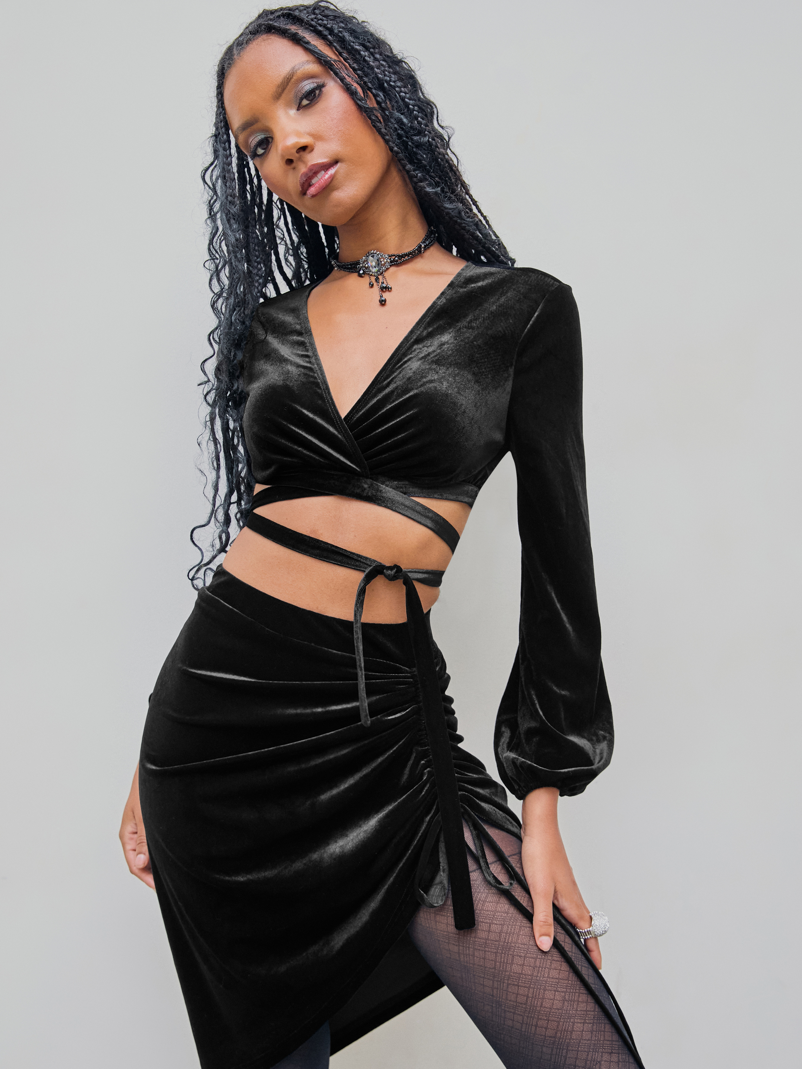 Velvet V-neck Solid Drawstring Knotted Long Sleeve Crop Top