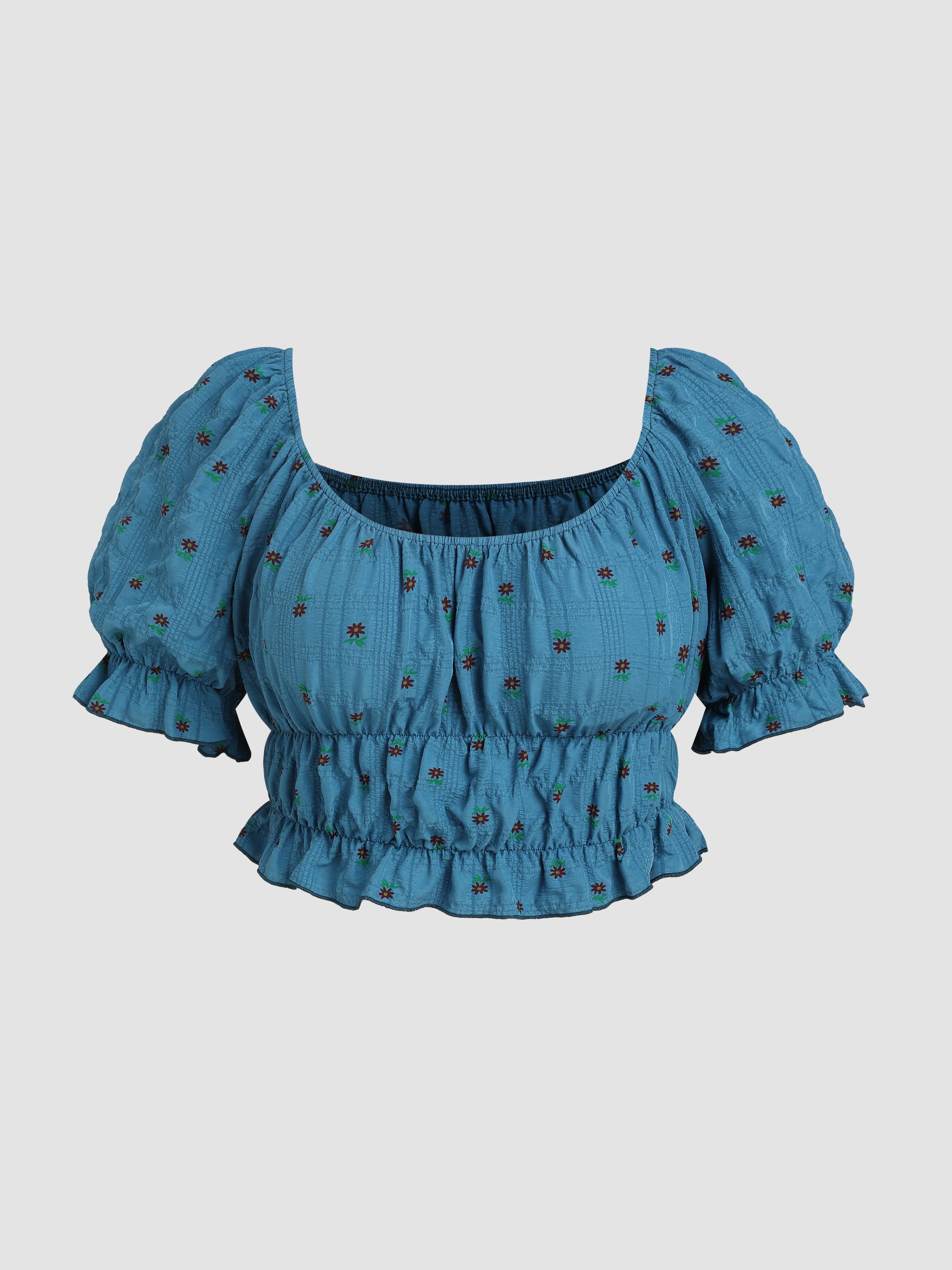 Floral Square Neck Puff Sleeve Ruched Blouse Curve & Plus
