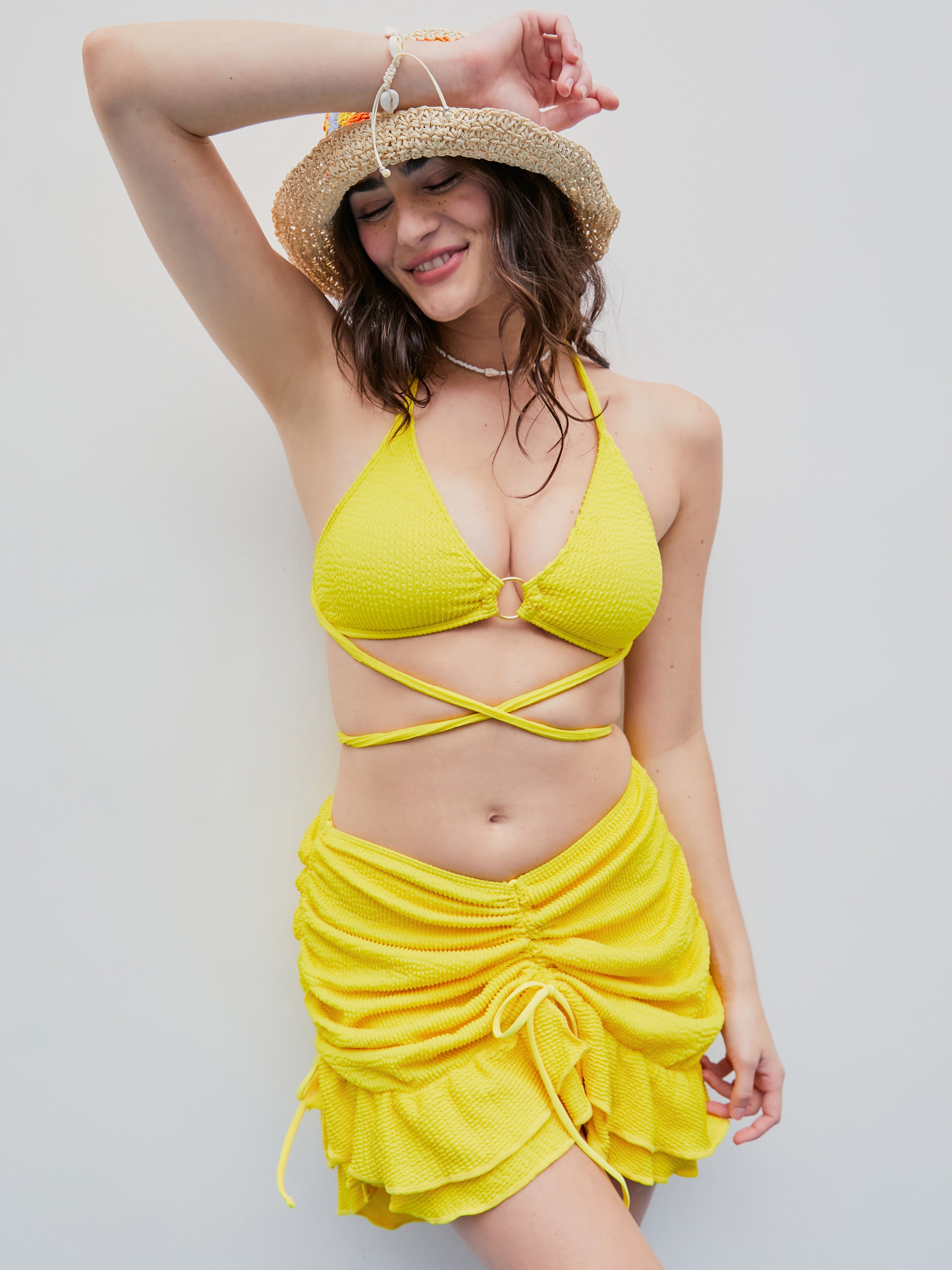 Halter Knotted Ruched Ruffle Hem Bikini Set & Sarong